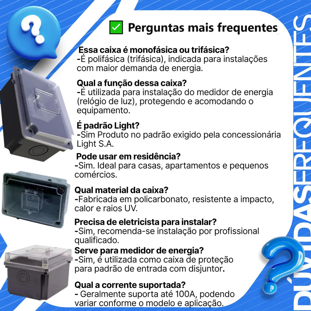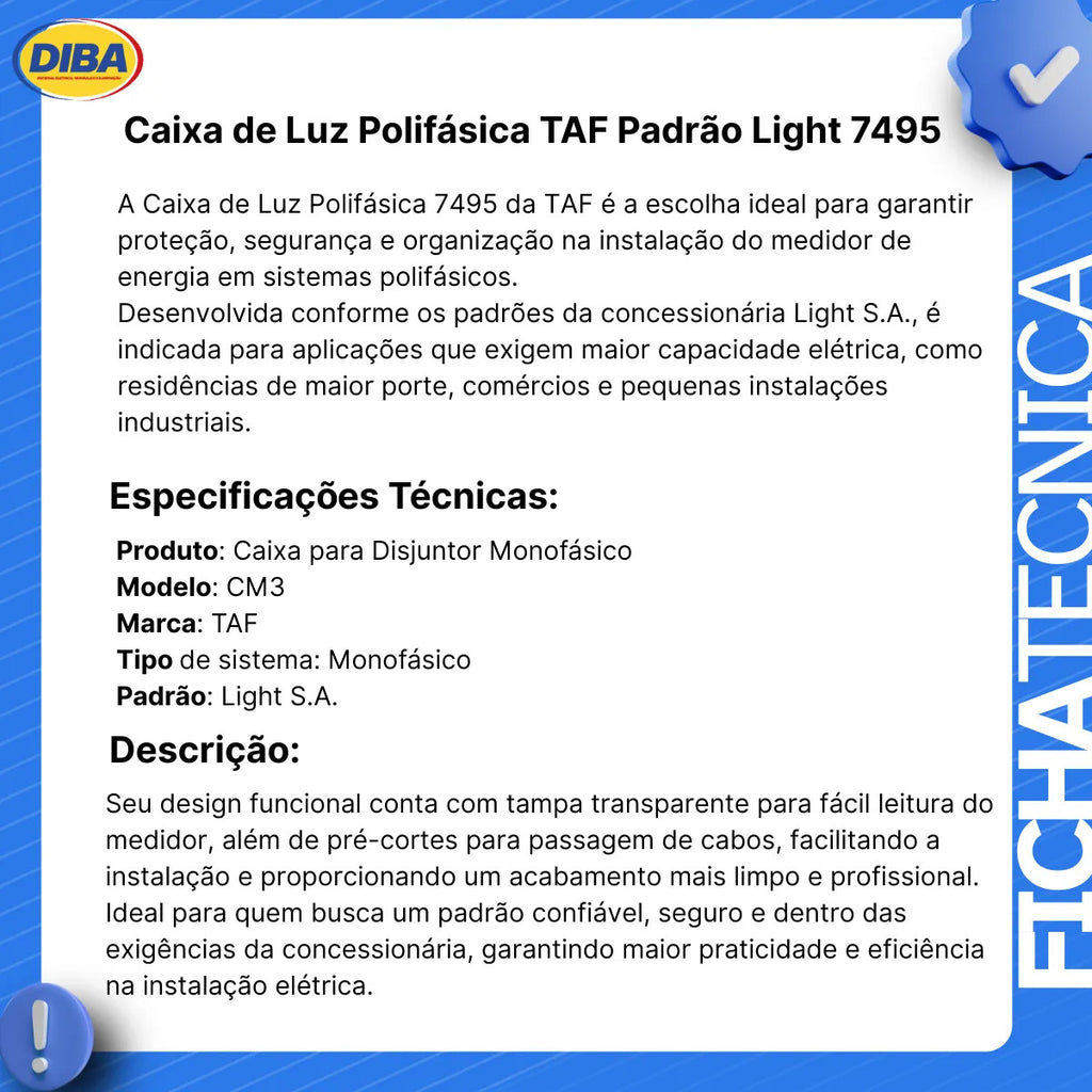 A Caixa de Luz Polifásica 7495 da TAF é a solução ideal para garantir proteção, segurança e organização na instalação do medidor de energia elétrica em sistemas trifásicos.